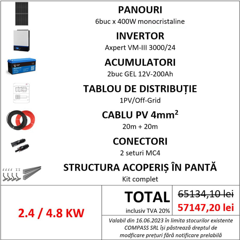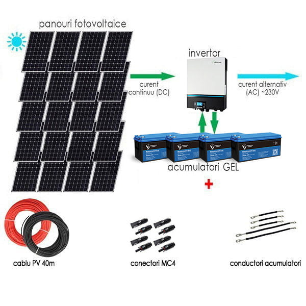 Состав набора: Фотоэлектрические панели; Инвертор со встроенным чарджером, который может работать автономно (независимо от сети), или подключенным к сети/генератору; Аккумуляторы; Структура крепления; Распределительный щит; Кабели и разьемы.
