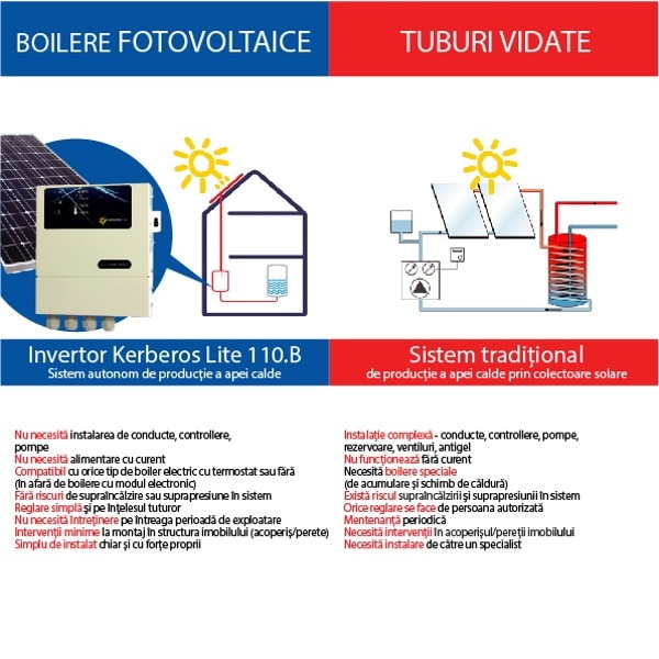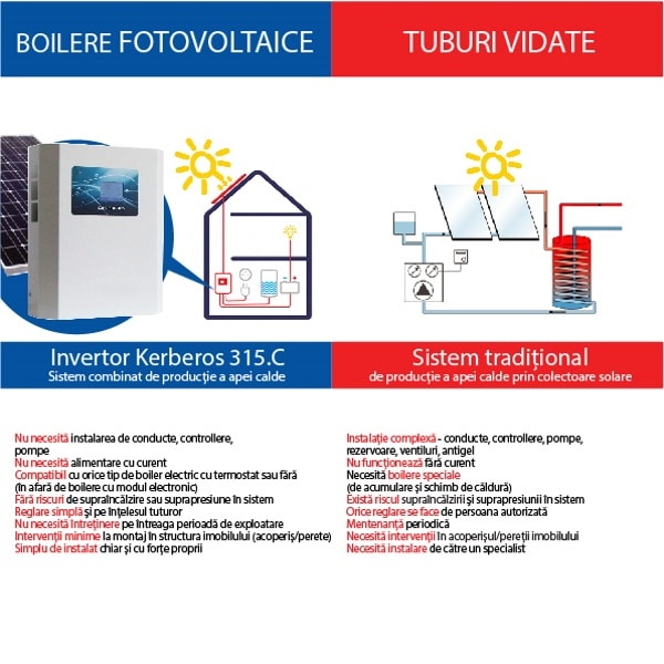 Фотоэлектрический бойлер адаптирует электрический ток, производимый фотоэлектрическими (фотовольтаическими) солнечными панелями, к нагревателю бойлера, таким образом – вся система нагрева воды имеет максимальную эффективность в течение любого периода времени. Адаптация текущих параметров выполняется автоматически, поэтому даже в плохую погоду с небольшим солнечным светом бойлер будет работать (минимальный порог мощности отсутствует), это означает, что даже мощность 50Вт может быть преобразована в тепло.