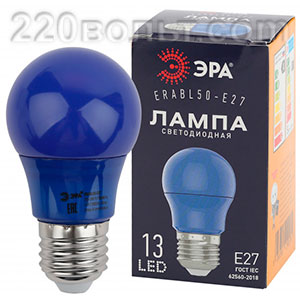 Лампа светодиодная ЭРА LED A50- 3W-E27 (диод. груша син., 13SMD, 3W, E27, для белт-лайт)