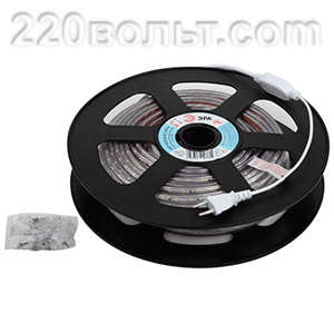 Светодиодная лента 220В, одноцветная, влагозащищённая. Рекомендуется для уличной подсветки. Лента на двустороннем скотче. Для надежного крепления в условиях перепада температуры и влажности применяются крепежные силиконовые скобы ЭРА. Торцы ленты необходимо закрывать заглушками. Внимание: во избежание выхода из строя не допускается длительная работа ленты в смотанном виде!