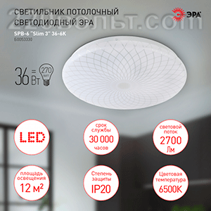 Светильник потолочный светодиодный SPB-6 Slim 3 36-6K без ДУ 36Вт 6500K ЭРА